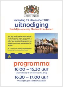 De stadswal en de brug zijn het resultaat van een uniek burgerinitiatief door stichting Stadswal Heukelum. Op 29 december is de feestelijke overdracht van de stadswal en de opening van de brug. Alle vrijwilligers, sponsors en inwoners van Heukelum zijn hiervoor uitgenodigd.