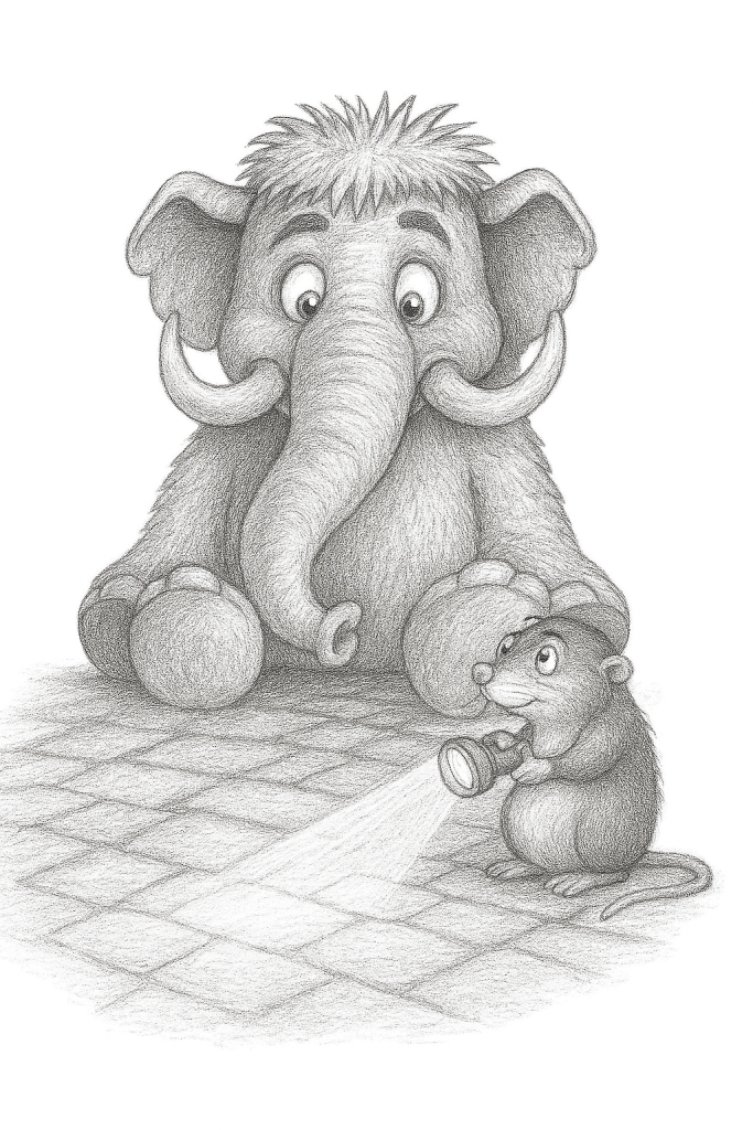Mammie de Mammoet, die al sinds de ijstijd door de straten van West Betuwe wandelt, fronst haar wenkbrauwen. “Wat is dat nou voor een plan?” bromt ze terwijl ze haar wollen sjaal rechttrekt. “In het donker zie je niet waar je loopt! En die stoeptegels… die liggen scheef, verzakken, kraken onder mijn poten. Als ik struikel, wie vangt mij dan op? Een egel met een zaklamp?”
